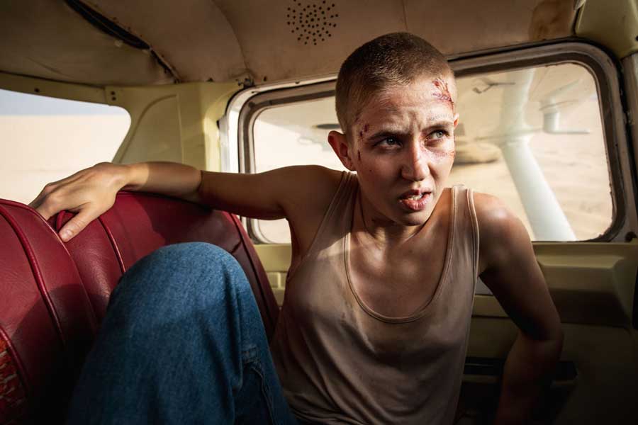 Instead, it’s Julie – who is now sporting a crewcut and a face tattoo (“pancake sirup” over her left eyebrow) – crashing into the desert in a small plane. There, from the desert where she waits to finally die, we get the story about how she ended up there.