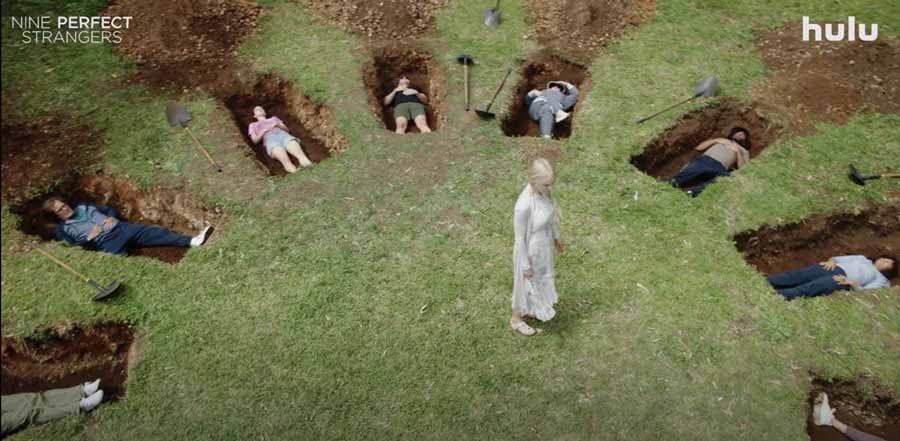 Because the mystery part of this thriller is what keeps you on the edge of your seat while watching. The characters and dialogue just make the ride there so much fun. Imagine nine perfect strangers (yeah, the title is accurate even if some of them arrive together), who need to heal and transform. All is not well, indeed!